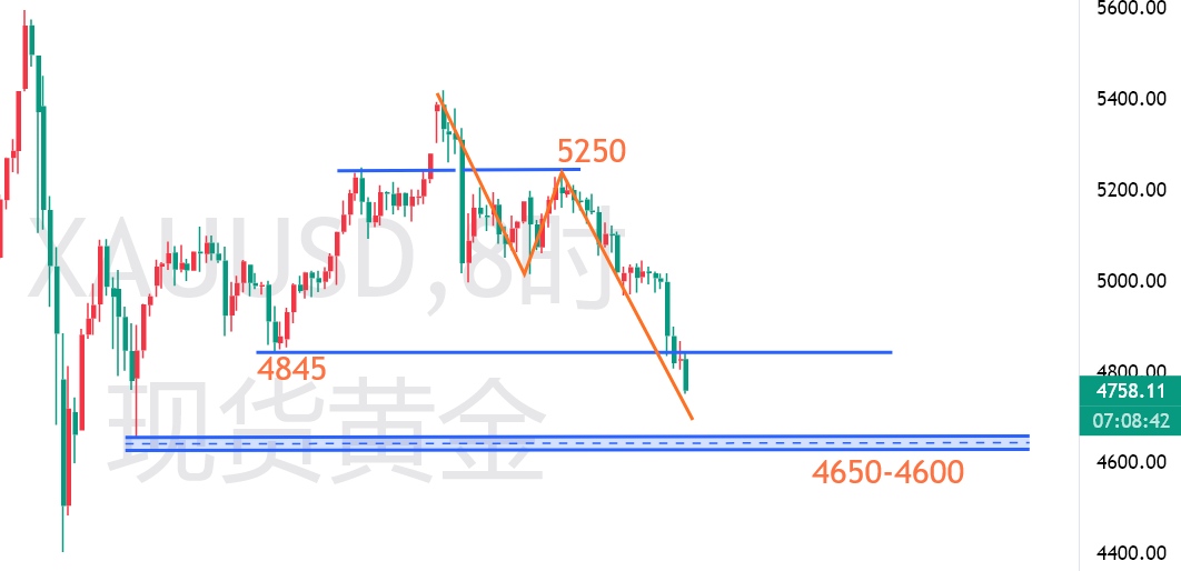 周初盘整后周三下破至4800,早间强调日图K线组合呈空头排列,周尾延续震荡看跌,买入时间节点下移,等待实际企稳信号;白盘反弹4867后急跌4750,欧美盘继续主空;短线阻力4780-4800,强阻4820;短线支撑4750,强支撑4700,破位下看4650前期平行攻防;