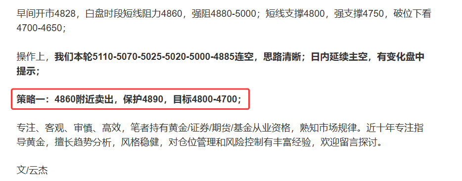 操作上,我们本轮5110-5070-5025-5020-5000-4885连空,今天4860空轻取4780;晚间延续主空,有变化盘中提示;