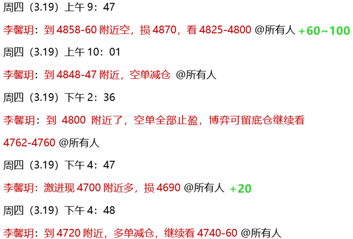3.19 周四,公开策略黄金4860顺势做空,踏准了日内反弹高点,又延续大跌至4686附近,超170点空间,恭喜关注的朋友大赚!实盘中,白盘同样安排了4860-58空单,顺利到4800、4760目标止盈!目前欧盘又排了4700附近多单,短线到4720获利!
