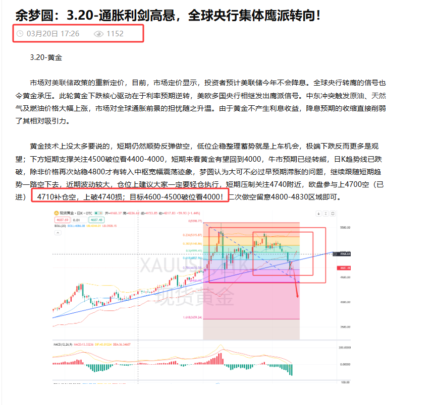 3.20-周五黄金顺势做空4700空目标4500-4400符合预期