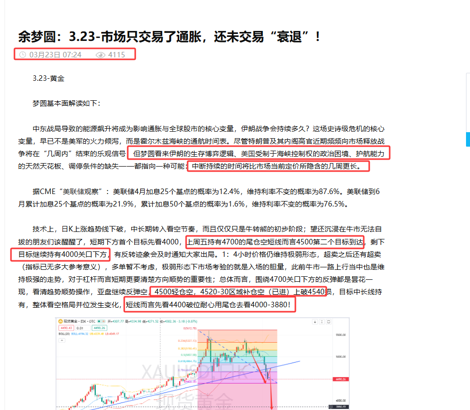 技术上,晚间博文给出的反弹4410-20的空首最低跌至4338也有50个点左右空间,特朗普突然放出的利好消息梦圆看来只是短期的强化了4100支撑,但原油价格趋于稳定,伊朗战争带来的能源冲击是大格局上利空黄金的,下破预期只是时间上的问题,4小时图来看价格仍然是良好的保持中轨下行放量状态,如若价格短期收复不了4600关口仍然是偏弱低位的整理蓄势看待,很多人认为黄金4100见底了,但梦圆短中期结合所有看法始终认为只是严重超跌的报复性反弹修正,并没有真正意义上趋势反转,即便是跌势有所放缓陷入低位震荡整理当中,短中期也不改震荡偏空坚持反弹空思路执行;只是目标上稍微影响,空间上短时间内完成的乐观程度缩减了而已,预期反复空,反复围绕几十上百点进行减仓动作了,晚间的分批布局空,即便第一波大家不能及时临盘应急的做减仓被扫损了,但是第二波的4500上下10美金的进场空截止目前为止下破4400也有100个点的空间了就要及时减仓,剩下的尾仓继续飘着去看4100的破位(更需要耐心了)止损下移破4513损,损了再重新布局无伤大雅,低多不做考虑,只做趋势顺势单。