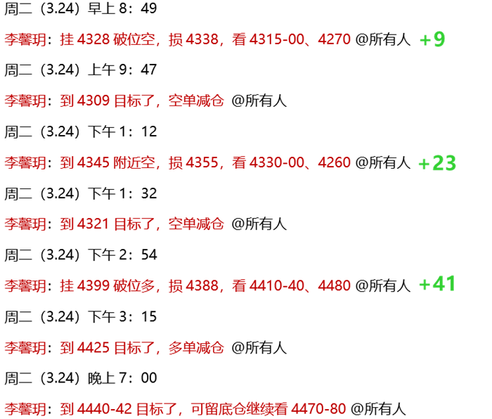 3.24 周二,黄金震荡思路对待,欧盘策略4440-4308区间高空低多,高点如期回落 ,实盘中,考虑到左侧拦截难度加大,我们选择右侧跟随更稳的打法,早间的4328挂空单,到4309-05目标获利!午后提前安排的4345空单,到4322-21目标获利!欧盘前4399的挂多单,顺利到4440-42目标止盈!日内短线节奏非常好,整体斩获73点,虽然没有大止盈单,但好在稳健且轻松!