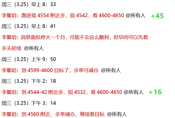 3.25 周三,公开策略黄金4532做多,又是精准预判,跟上即赚!馨玥没有模棱两可的操作区间,只有确切的进场位置,拒绝马后炮!实盘中,早间强势逼空上涨,直接安排了4554多单,顺势跟进到4600止盈目标!午后回踩又安排了4542多单,目前已到4565上方,继续获利!日内