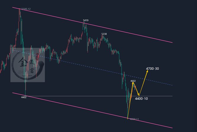 策略二:黄金回调4400-4410附近分批做多(买涨)十分之二仓位,止损4380,目标4500-4600附近,破位看4700一线;(策略具有时效性,更多实施布局建议在钉钉实盘学员内部公布)