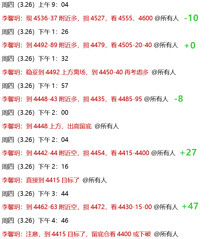 3.26 周四,黄金午后持续受到主力砸盘影响,走出大跌空间,实盘中,早间安排的4536多单扫损出局,午后安排的4443多单,受砸盘影响也无奈扫损!随后盘中调整思路,反手安排了4442空单,到达4415目标获利!而后后又安排了4462空单,目前到4415目标再获利!不骄不躁,扭亏为盈!