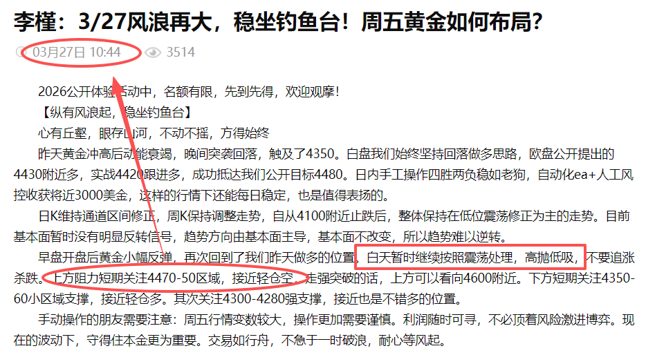 3月26日周四欧盘公开提出的4430附近多,实战4420跟进多,成功抵达我们公开目标4480。日内手工操作四胜两负稳如老狗,自动化ea+人工风控收获将近3000美金,这样的行情下还能每日稳定,也是值得表扬的。