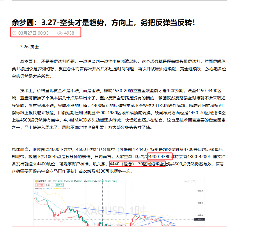 技术上,4600下方跟4500下方反弹就做空,随着时间的推移决定多头反转就位于4600的再次突破情况了,4小时布林低位走平,整体结构整理蓄势待发,横久必跌的道理;大家千万不要盲目乐观把下方云支撑当做筑底去看待,到时候行情按照梦圆预期走出来了大跌,反复多的人就会一直看多,到时候又是重大亏损,方向的重要性就不过多重申了,凌晨时段给到大家的4440轻仓多,4470补仓多,美盘前最低跌至4410附近2单子又是超几十个点利润,进行了减仓持有后,止损直接下移,从4500止损改成破4490短损,损了再临盘再作布局,感谢大家关注,4470仍然可以反复做空!这单子最后损20个点也无伤大雅,重新布局即可。