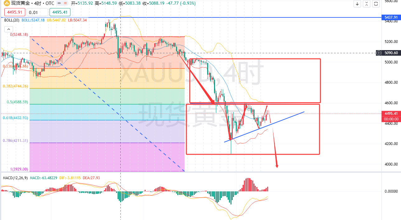 油价狂飙、美古重挫,美债收益率却罕见回落!针对这一反常现象,市场给出了双重解释。一方面,投资者开始怀疑能源危机是否真的会导致美联储逆势加息,高位收益率吸引抄底买盘,;另一方面,市场焦点已从短期通胀恐慌,急转为对长期经济衰退与增长下行的深度担忧。结合技术上,随着时间推移4小时布林持续收窄也就意味着破位方向确认选择,下方4430关键支撑破位的话下破4100岌岌可危,短线至少能看到4200,同时上方多头承接力较差,风险的不确定性导致市场也是保持谨慎的一个态度,最终宽幅震荡收尾,方向趋势始终都会走出来的,操作上也不会又多又空去操作,会影响大方向上的判断,当然了,这也只不过是梦圆的交易体系,围绕4600下方主空不变,突破企稳短期跟随,情况有变再灵活进行调整,特朗普的短期托底利好黄金,不要过早确认底部。