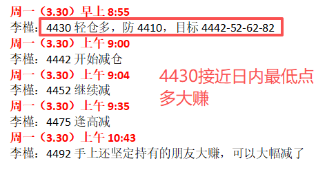 3月19周四公开4500-4550抄底多,周五反弹最高触及4735附近。周五欧盘公开给出的日内短线回落4630-40做多,刚发完立马兑现,反弹最高触及4695,自行跟上的朋友都收获不错。