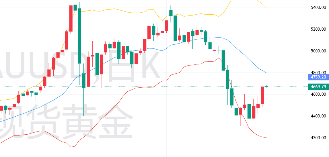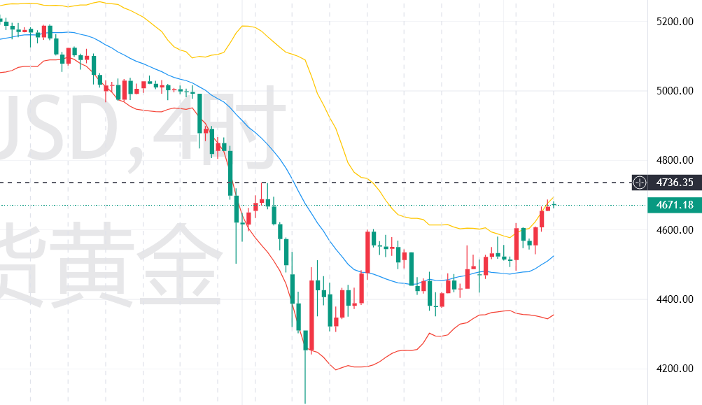四小时级别来看,金价呈现加速上涨态势,突破前期震荡区间,进入强势上行通道。RSI指标自低位持续回升,目前接近超买阈值,显示多头动能强劲,但需警惕短期获利盘出逃引发的回调;MACD指标红柱持续扩张,空头动能彻底衰减,多头完全占据主导,贴合金价暴涨走势。布林带大幅向上开口,价格运行在布林带上轨上方,强势特征明显,上轨压制作用完全失效,下方依托5日均线形成有效支撑,存在小幅回踩整固需求,但未出现明显见顶信号,回踩企稳后仍有冲高可能。