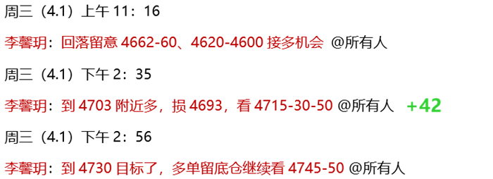 4.1 周三,早间策略黄金4662做多,实际日内回踩4667后拉升,符合回踩做多思路!实盘中,虽然没到策略做多位置,错过了低点进场机会,但午后也安排了4703多单,直接跟进,目前已到4745-50目标,先斩42点利润!
