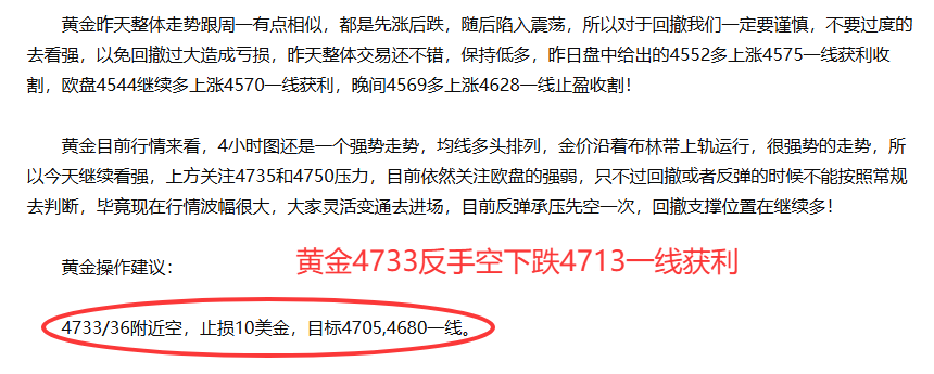 今天黄金多空全部获利拿下,早间4667多上涨4730一线止盈收割,拿下630点利润,下午4733反手空下跌4713一线获利,4710多上涨4738一线获利收割!