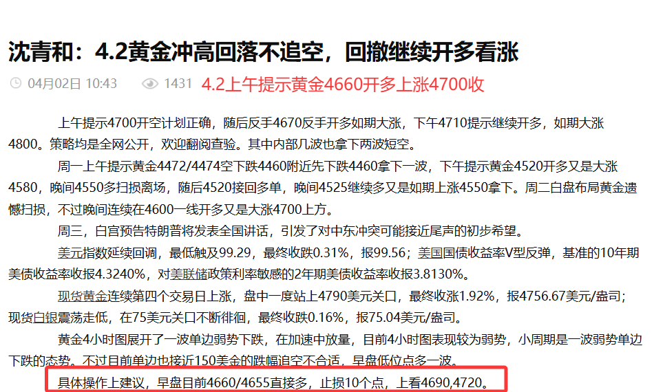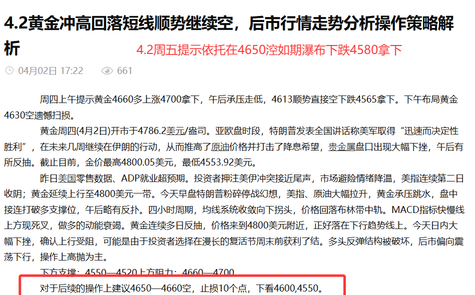 周一上午提示黄金4472/4474空下跌4460附近先下跌4460拿下一波,下午提示黄金4520开多又是大涨4580,晚间4550多扫损离场,随后4520接回多单,晚间4525继续多又是如期上涨4550拿下。周二白盘布局黄金遗憾扫损,不过晚间连续在4600一线开多又是大涨4700上方。周三上午提示4700开空计划正确,随后反手4670反手开多如期大涨,下午4710提示继续开多,如期大涨4800。策略均是全网公开,欢迎翻阅查验。其中内部几波也拿下两波短空。周四上午提示黄金4660多上涨4700拿下,午后承压走低,4613顺势直接空下跌4565拿下。下午布局黄金4630空遗憾扫损。不过晚间内部二次布局4630做空如期下跌4580拿下,企稳后,4634做多上涨4670,反手4693做空又是如期下跌拿利。