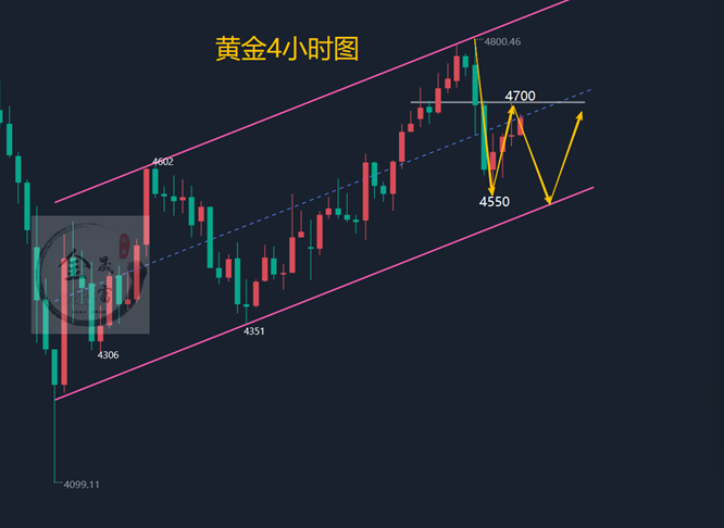 4小时周期布林收口,有效区间在4800/4500,短期内,难以破位此区间,就不会有单边走势,所以,下周在市场变动不大的情况下,关注此区间的得失。1小时冲高回落大跌之后,黄金目前还是处于反弹修正的行情,黄金现在短期来说,可能还将延续调整,如果明天非农利空,周末再有消息的刺激,当然,川普一句话就能引爆市场,如果下周有新的消息面公布,非农数据公布,美联储政策转向的话,黄金上破4800,就可以看5000,下破4500,就可以看4350,到时候我们再作具体分析。综合来看,今日黄金短线操作思路上金晟富建议反弹做空为主,回调做多为辅,上方短期重点关注4700-4720阻力,下方短期重点关注4500-4550一线支撑,各位朋友一定要跟上节奏。要控制好仓位及止损问题、严格设止损,切勿抗单操作。具体点位以盘中实时为主,欢迎前来体验,交流实时行情,进群关注实时单。