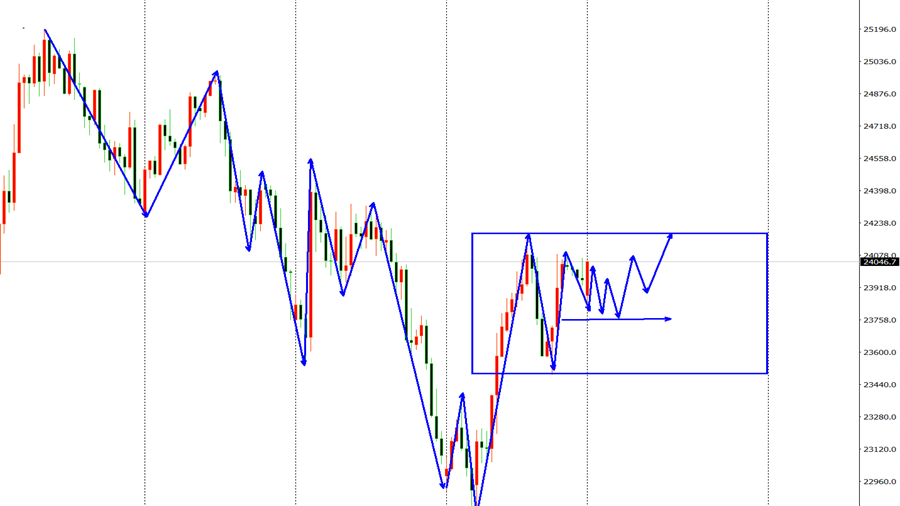 纳指市场上周四开盘在23998.35美元,后行情先拉升给出24067.25美元,后行情强势回落,日线最低给到了23485.6美元,后尾盘强势拉升,日线最高触及到了24085.37美元,后整理,日线最终收线在了24037.05美元,后日线以一根下影线极长的启明星形态收线,周线级别收录一根大阳线,而这样的形态收尾后,纳指依旧处于区间震荡中。综合来看,高博景总结:纳指低位企稳之后,运行在前期区间来回考验,今日操作上考虑回撤布局多单为先,高空为辅,上方关注24162-24500美元阻力,下方关注23800-23500美元支撑。