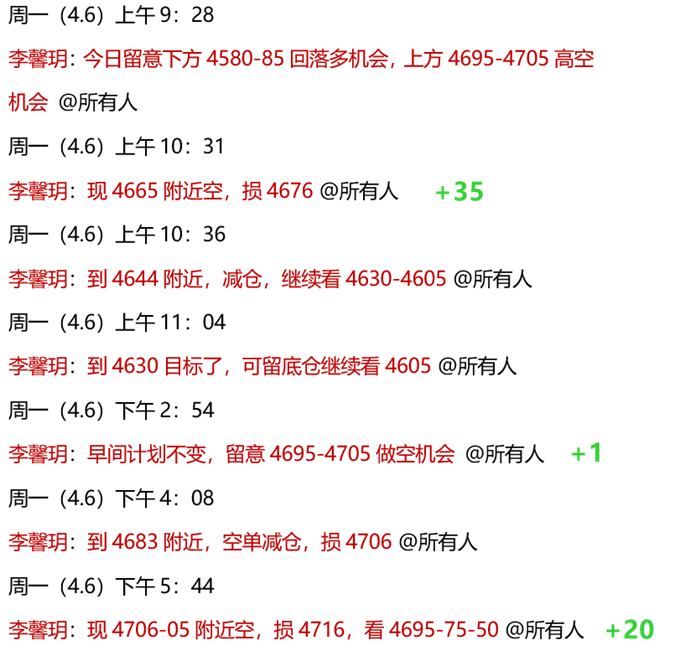 4.6 周初,黄金开盘低开回落,完全符合周评预期,策略4705做空,触及后如期回落!实盘中,上午冲高先安排了4665空单,在4630顺利到4630目标止盈!欧盘前,又安排了4695空单,在4683减仓小赚!欧盘后,按策略安排的4705空单,也到4685获利!