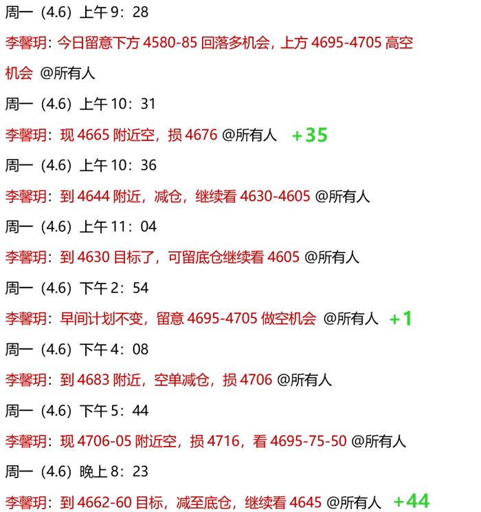 4.6 周初,黄金开盘低开回落,完全符合周评预期,策略4705做空,触及后如期回落!实盘中,上午冲高先安排了4665空单,在4630顺利到4630目标止盈!欧盘前,又安排了4695空单,在4683减仓小赚!欧盘后,按策略安排的4705空单,晚间到4660获利!公开策略清晰可见,没有模棱两可,实盘中三连空全胜,关注的朋友也能有不错收获!