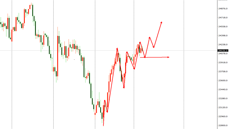 纳指市场昨日低开在23879美元,后行情先回落,日线最低给到了23802.91美元,后行情强势拉升,日线最高触及到了24279.57美元,后整理,日线最终收线在了24171.89美元,后,日线以一根上影线稍长于下影线的大阳线收线,而这样的形态收尾后,纳指有进一步延续的概率。综合来看,高博景总结:纳指在低位企稳之后向上突破,在23489区域形成了二次向上突破,结合日线级别大阳线,有进一步突破的概率,今日操作上考虑回撤布局多单为先,高空为辅,上方关注24300-24550美元阻力,下方关注24029-23800美元支撑。