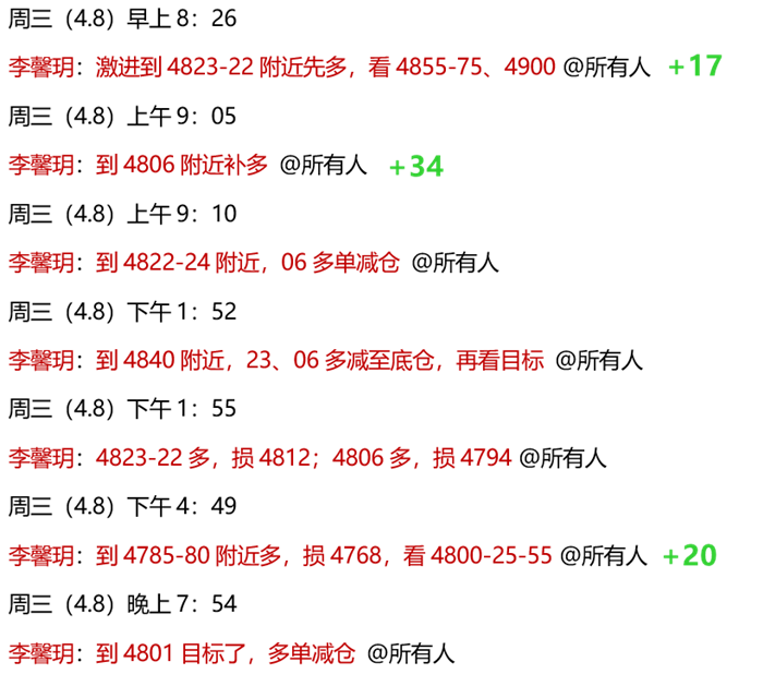 4.8 周三,白盘策略明确黄金看涨做多思路,实盘内,早间安排的4823多单和4806多单,午后到4840附近获利,先下一城!欧盘安排4780策略多单进场,目前到4807附近,已有不错收获!今日三连多全胜71点,公开操作全网可见,拒绝马后炮!黄金晚间支撑在4760-50、4720,是可以考虑接多的位置,企稳上冲再逐步看至4857、4900!