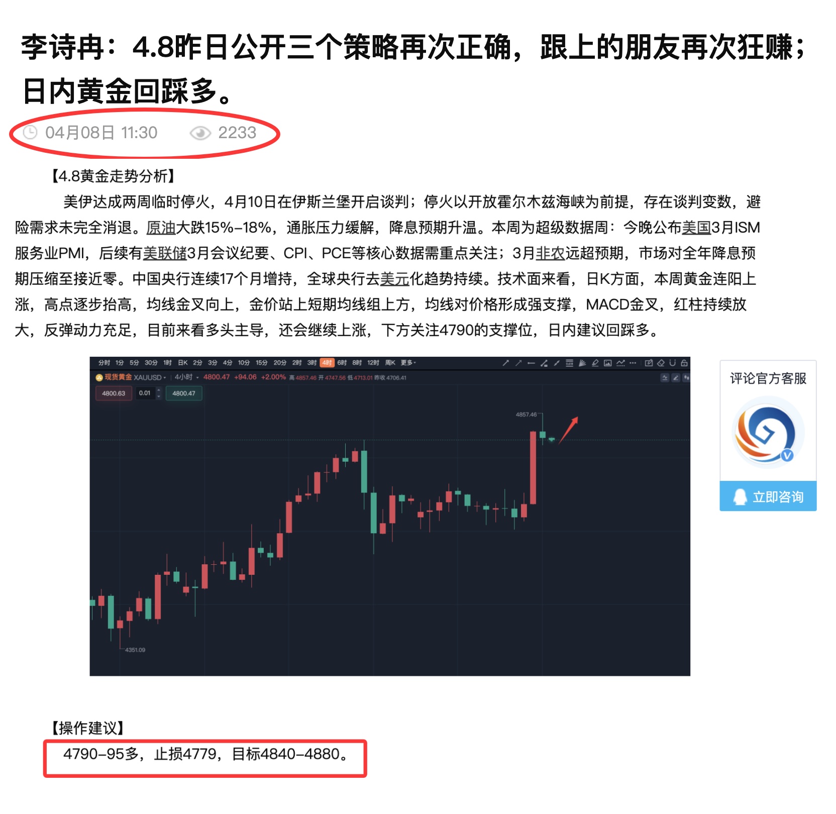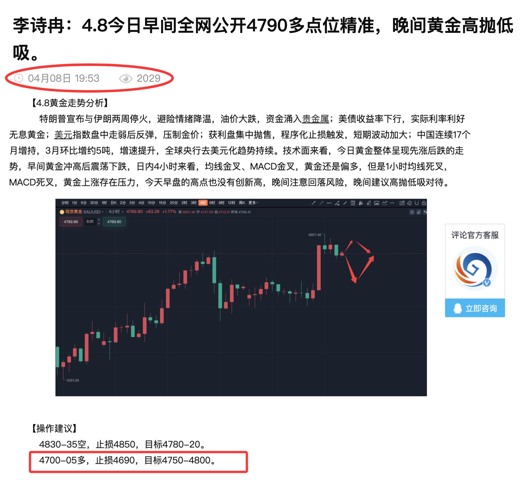 昨日公开两个多单策略点位精准,今日实盘一多一空大赚370点,最近已经连续多天公开策略全对;昨日早间全网公开4790多,黄金如期跌至4790后上涨,晚间公开4700-05多,黄金如期跌至4700上涨,点位把握的很精准,最近每天公开策略都对,并且点位精准完美;今日早间实盘在4707提示多,上涨至4730提示离场,这单获利230点;第二波实盘在4721提示空跌至4707提示离场,这单获利140点;跟着诗冉有肉吃;关注诗冉不迷路,专业不浮夸、风控不松懈,用真实换信任;发文给策略次数有限,需要获取更及时的策略请前往主页获取诗冉老师联系方式即可,选择大于努力。