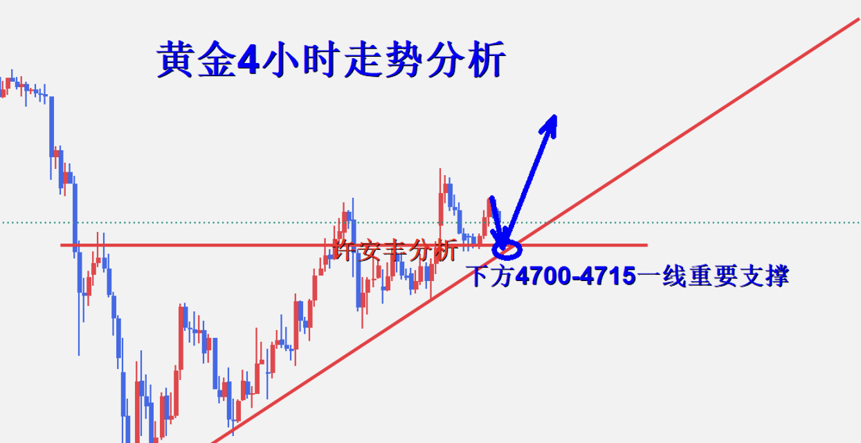 黄金近期走势跌宕起伏,但是全都有一个共性就是回踩探底再反弹,我相信关注老许本人的朋友都可以看得到,近期我们多次在下方布局多单策略,也多次直接给出现价策略多单进场,因为黄金的趋势就是一个回踩调整探底反弹的一个思路,今天我们关注下方4700-4715一线支撑,回踩我们继续找机会做多,毕竟昨天我们早盘也是在4695-4700一线直接多,多单如期反弹,4700一线关口没有得到实质性的突破,那么多头反弹也符合技术面多头走势,关注老许,带你走出操作困局!如果你目前操作不理想,希望许安丰能让你的投资少走弯路,欢迎前来沟通交流!