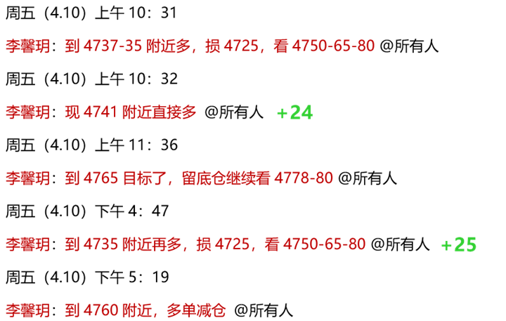4.1 上周三,早间策略黄金4662做多,实际日内回踩4667后拉升,符合回踩做多思路,同时4760压力也精准预判回落!实盘中,虽然没到策略做多位置,错过了低点进场机会,但午后也安排了4703多单,顺利达到4750目标,先斩47点利润!晚间上冲给了个别激进学员4760空单,再获利!
