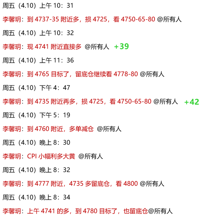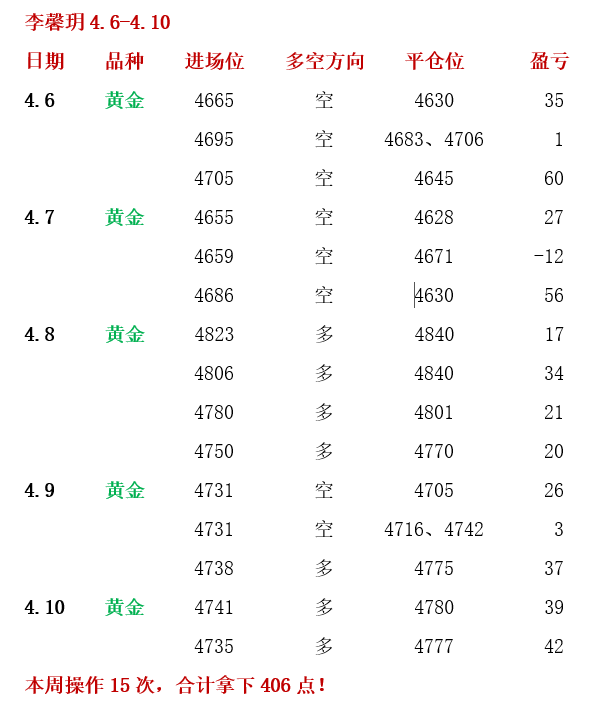 4.10 周五,黄金早间策略4736-35低多,完全符合预期上涨!实盘中,白盘下探先安排了4741多单,欧盘二次下探后,到4735继续做多,持有至美盘CPI公布后,到达4777-80止盈出局,整体斩获81点!恭喜关注的朋友,本周策略完美把握,全网见证,往前翻随便查验,跟上的都有不菲收获了!本周15单只错1单,提前祝大家周末愉快!盘尾还想操作的就参考上一篇分析!