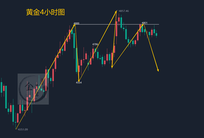 黄金4小时横盘震荡,不过只要不站稳4800一线,短线4小时可能还是继续构筑这一轮反弹的头肩顶形态,不过要记住,如果持续在靠近4800附近震荡,那么重心就会上移,那么最终可能突破上行的概率就会增加,所以最好就是要下周一开始走弱,如果周一不能走弱,那么大概率就要延续反弹上涨,基本上就会突破4860一线的阻力,冲击5000附近的可能。下周一周末没有特别利好黄金的支撑,那么就可以短线承压4800一线先继续高空,如果持续到美盘周一不能下破4700,那么就要注意周二调整思路低多顺势看突破上行。综合来看,下周一黄金短线操作思路上金晟富建议反弹做空为主,回调做多为辅,上方短期重点关注4780-4800阻力,下方短期重点关注4700-4650一线支撑,各位朋友一定要跟上节奏。要控制好仓位及止损问题、严格设止损,切勿抗单操作。具体点位以盘中实时为主,欢迎前来体验,交流实时行情,进群关注实时单。