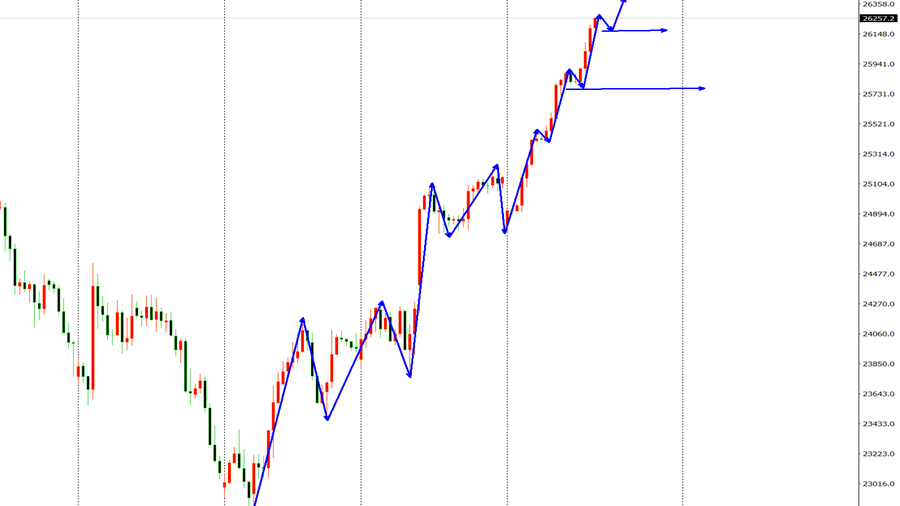纳指市场昨日延续拉升过程,早盘开盘在25816美元,后行情回踩25762.07的日线低点后行情美盘拉升,日线最高触及到了26213.55美元,后整理,日线最终收线在了26190.47美元,后,日线以一根略带影线的饱和大阳线收线,而这样的形态收尾后,纳指依旧处于多头强势运行中。综合来看,高博景总结:纳指运行在一个小调大涨的形态中,后市延续上破的概率较大,今日操作上考虑回撤布局多单为先,高空为辅,上方关注26500-26700美元阻力,下方关注26000-25900美元支撑。