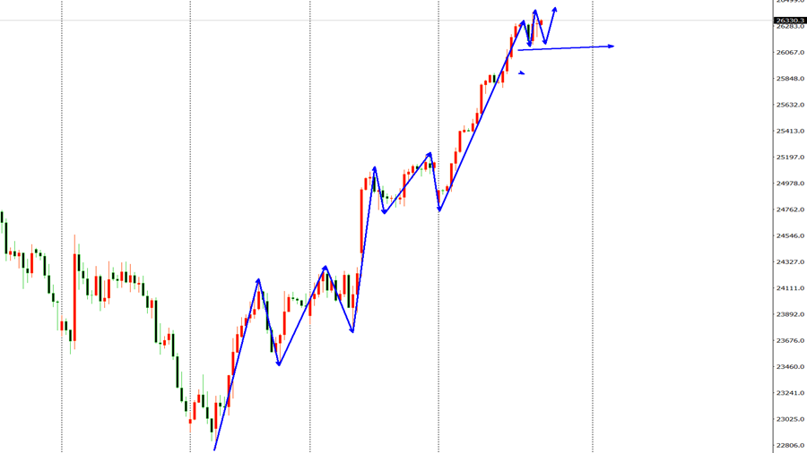 纳指市场昨日开盘在26188.79美元,后行情小幅拉升给出26328.29美元,后行情快速回落,日线最低给到了26106.04美元,后拉升,日线最高触及到了26406.31美元,后整理,日线最终收线在了26030.03美元,后日线以一根上下影线等长的小阳线收线,而这样的形态收尾后,纳指持续多头趋势中。综合来看,高博景总结:纳指强势上涨之后,在高位运行在一个小区间震荡选择,今日操作上考虑回撤低多为先,高空为辅,上方关注26400-26600美元阻力,下方关注26100-25900美元支撑。