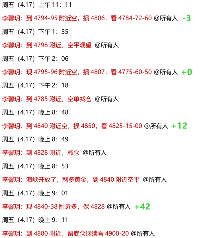 4.17 周五,白盘黄金策略4800压力做空,有不错回落空间!实盘中,白盘同样安排了4796-95空单,顺利到4785减仓小赚!美盘按策略上探4840也安排了空单,到达4828获利减仓,而后看到海峡开放消息面,剩余空单果断在4840全部离场!并且反手安排了4840-38多单,拿到4880上方大赚,并且留底仓博弈更大空间!计划赶不上变化,晚间波转向很及时,大家都很默契跟随,本周圆满收官!