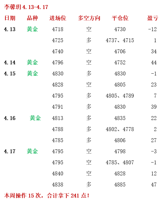 4.14 周二,公开策略黄金回踩4750多,同时关注4790-4800压力,多空全部精准预判,全网见证!实盘中,欧盘前安排了黄金4794-96空单,顺利到4755-52目标止盈,快准狠,斩获43点利润!但由于下探回升非常快,实际多单来不及上车!盘中跟大家反复强调,当前震荡要有耐心,我们做一单赚的就顶别人做一天!