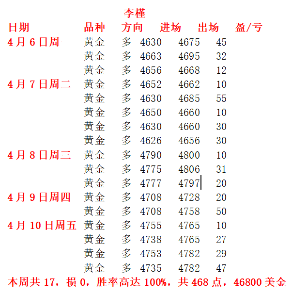 4月7日周二实战五次布局回落多,坚定持有的朋友,隔夜都很有收获。公开给出的4600-30多全部兑现大胜,前期预测的4800还保守了,黄金一涨势不可挡。