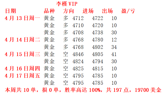 4月13日周一欧盘公开给出:回落4700-4695附近多,回落多次触及反弹都有不错的利润。实战更是回落附近三次做多,隔夜最高触及4776,起床直接收割。昨日已经是连胜的第6个交易日,连胜的20次布局,大家觉得我们连胜能坚持多久?