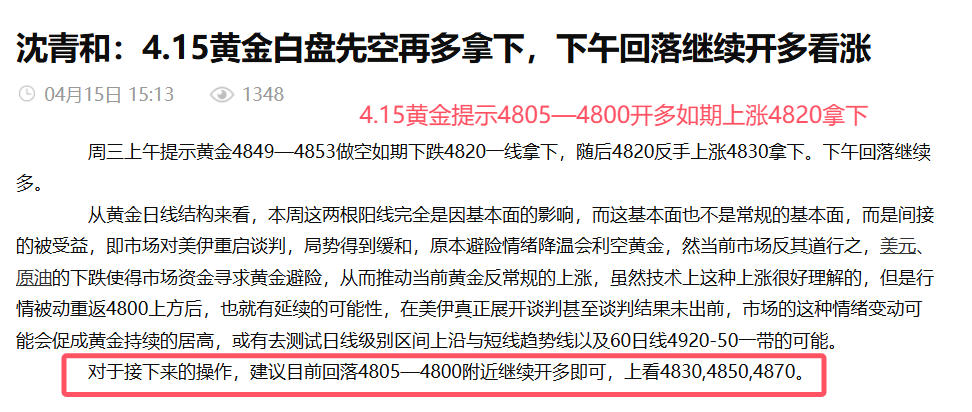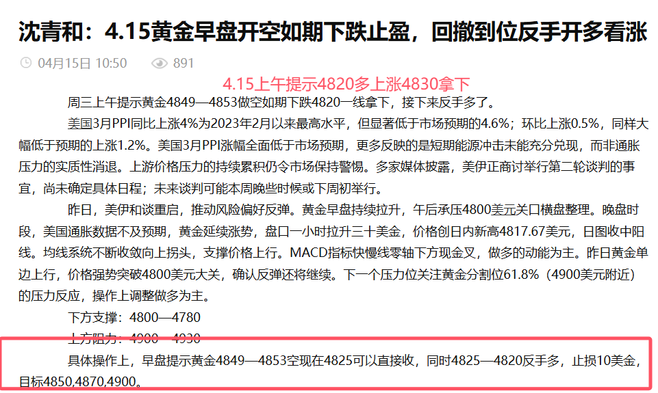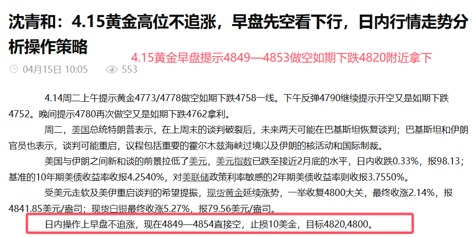 4.15周三上午提示黄金4849—4853做空如期下跌4820一线拿下,随后4820反手上涨4830拿下。下午回落4800开多上涨4820拿下,晚间布局4815空,4825补仓空如期下跌4790目标拿下。