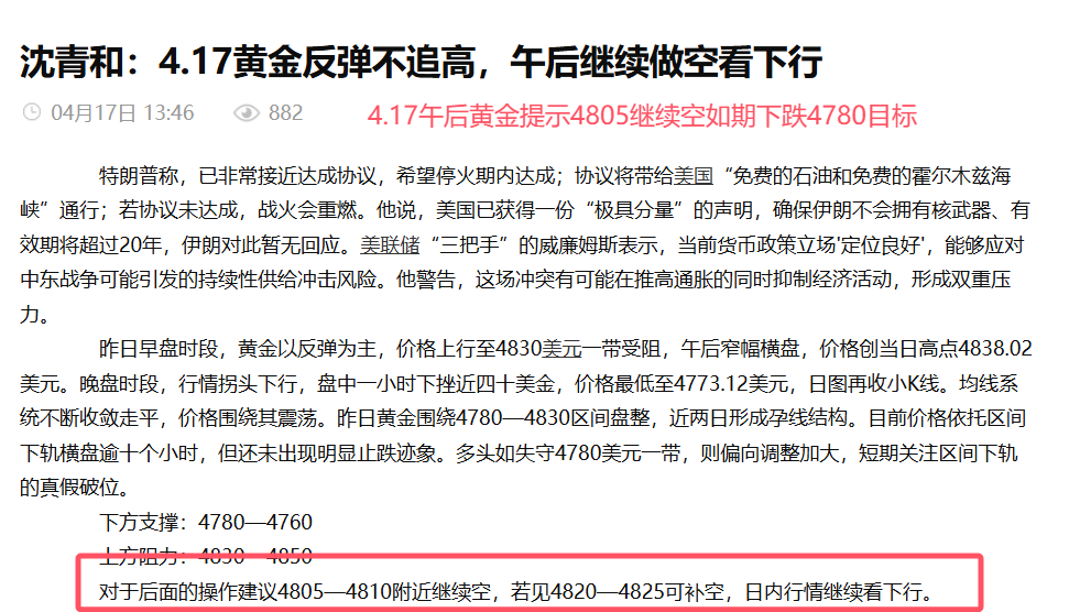 4.17(周五)黄金上午布局4790空,4805继续空下跌4780目标。晚间布局4810止损离场,随后晚间反弹4880空,4872空尾盘如期下跌。