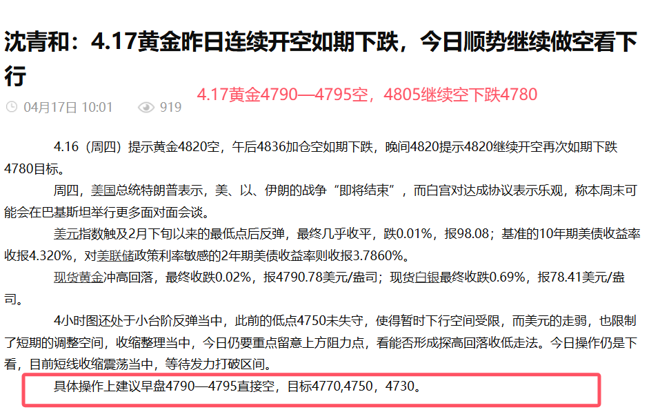 4.14周二上午提示黄金4773/4778做空如期下跌4758一线。下午反弹4790继续提示开空又是如期下跌4752。晚间提示4780再次做空又是如期下跌4762拿利。