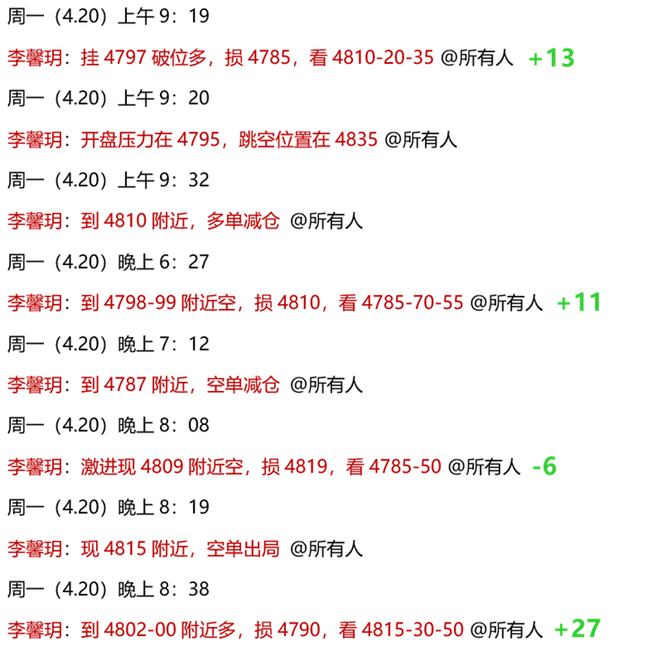 4.14 上周二,公开策略黄金回踩4750多,同时关注4790-4800压力,多空全部精准预判!实盘中,欧盘前安排了黄金4794-96空单,顺利到4755-52目标止盈,快准狠,斩获43点利润!但由于下探回升非常快,实际多单来不及上车!