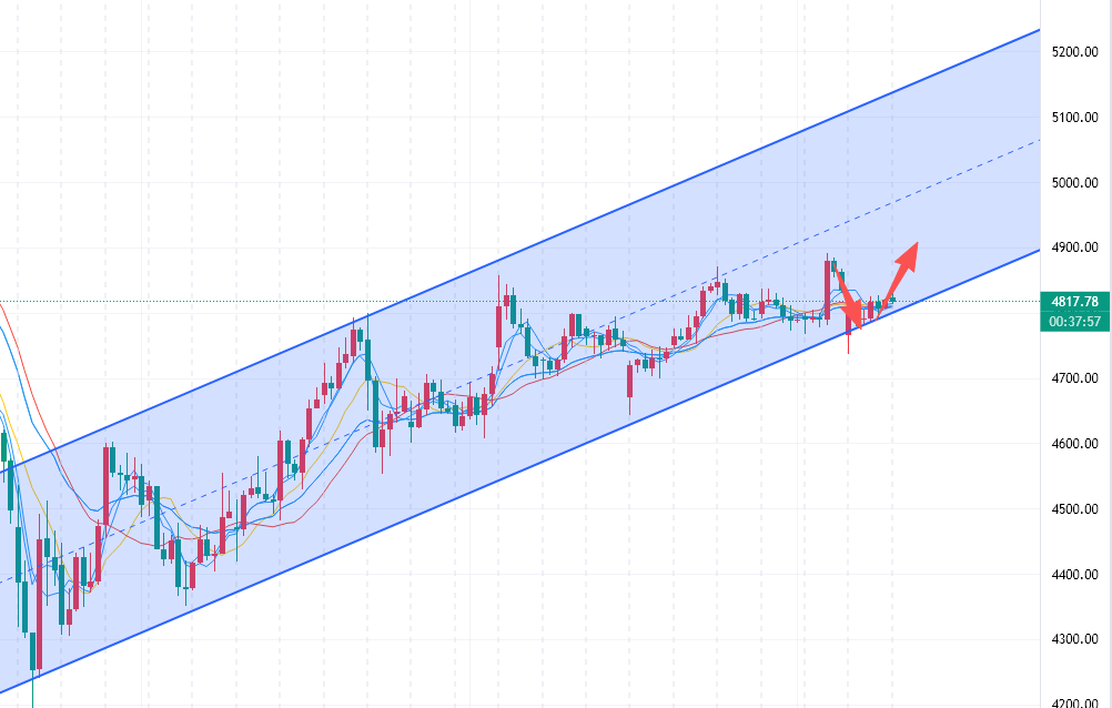 昨日跳空低开后强势V反,4小时随机指标金叉延续,今日继续回落做多为主。下方支撑短期关注4790-4800附近,接近轻仓多。上方目标短期看向4835,站稳这里依次看向4900-4930,甚至5000都近在咫尺。