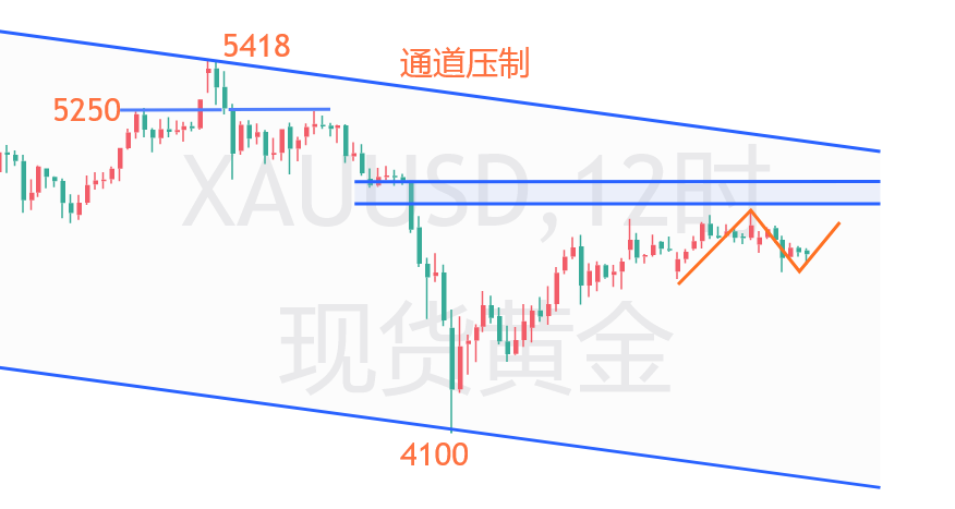 黄金,大趋势接连续分析所述,年初价格自5596历史高位首轮抛售4404,拉高5418后二轮抛售至通道支撑4100,目前处于上行周期。短期受美伊局势影响反复拉锯,待和谈落定美联储降息提振会测试5000附近通道压制攻防,但中期缺乏重返高位动力,积存金实物金勿盲目看涨。