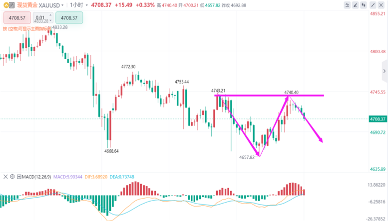 技术面从日线图来看,黄金价格自上月末触及阶段性高点后,便进入震荡回调通道。本周金价连续跌破5日、10日和20日均线,均线系统呈现空头排列,对金价形成明显压制。MACD指标在零轴上方死叉向下,绿色动能柱持续放量,表明空头力量占据主导。同时,金价下方关键支撑位在4650-4600美元区间,若该区间失守,金价可能进一步下探至4500美元附近。4小时图上,金价走势呈现明显的下降趋势,每次反弹均受到上方均线压制。近期K线多次出现阴线实体大于阳线实体的情况,显示空头力量较强。RSI指标在50下方运行,虽有短暂反弹迹象,但整体仍处于弱势区域。不过,在周四晚间金价触及4650美元附近后,4小时图出现了一定的底背离信号,预示短期可能存在反弹需求,但反弹高度或有限。基本面维度下,短期市场利空因素占据主导,美联储降息推迟、美指美债收益率高位运行,持续压制黄金上涨节奏,盘面大概率维持震荡偏弱的修复走势。