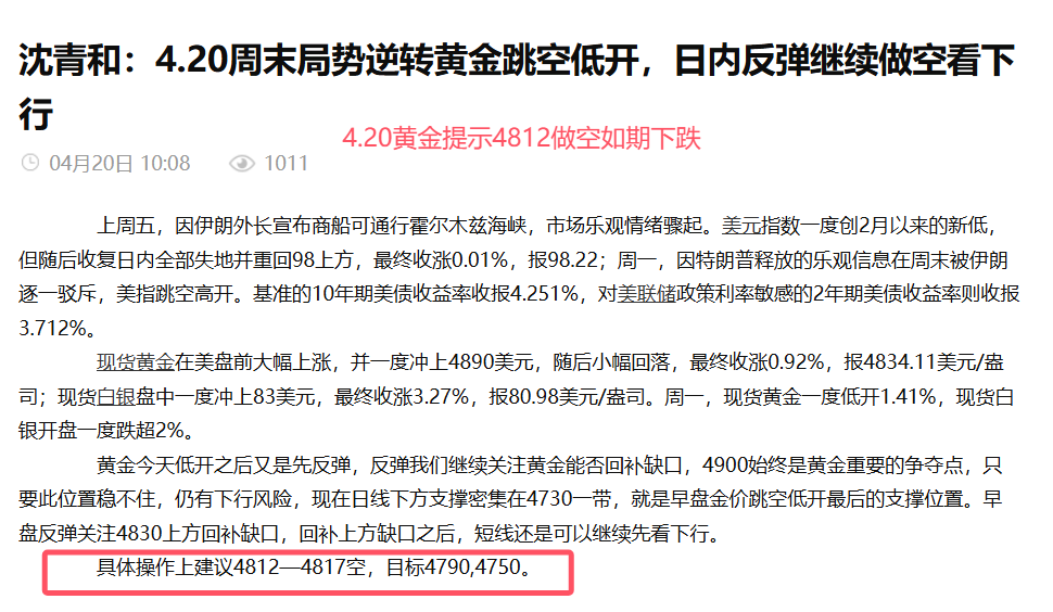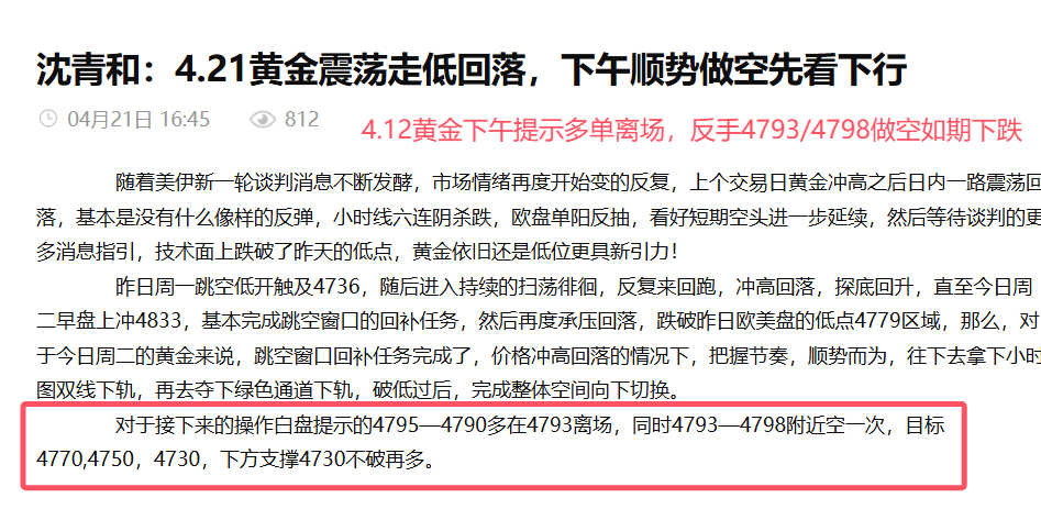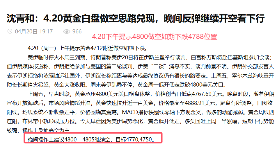 4.20(周一)上午提示黄金4812附近做空如期下跌4790附近,下午4800空下跌4788,晚间布局4810空止损离场,二次反弹4825/4823附近继续做空如期下跌4790附近。