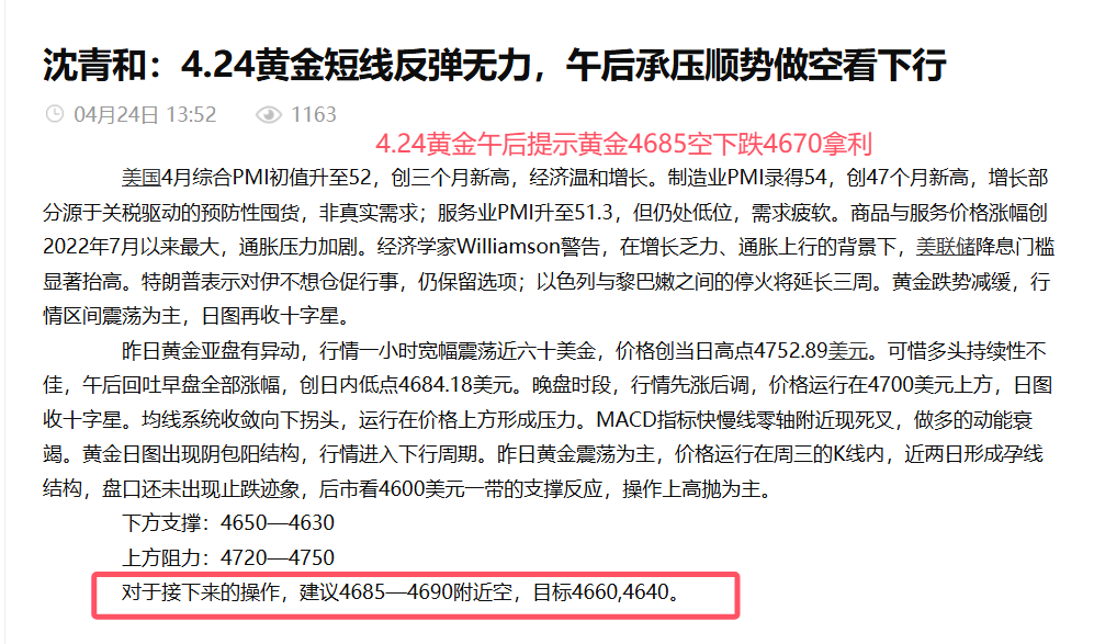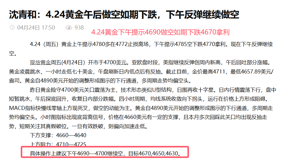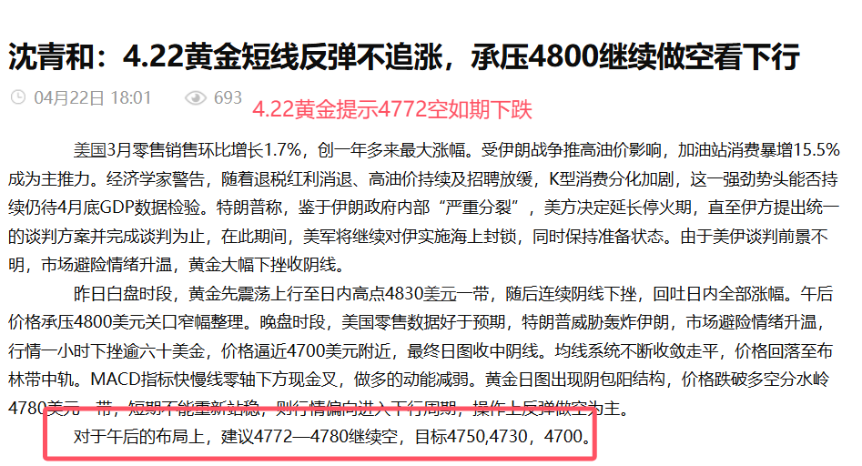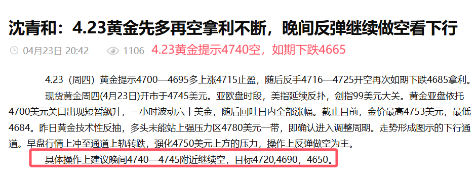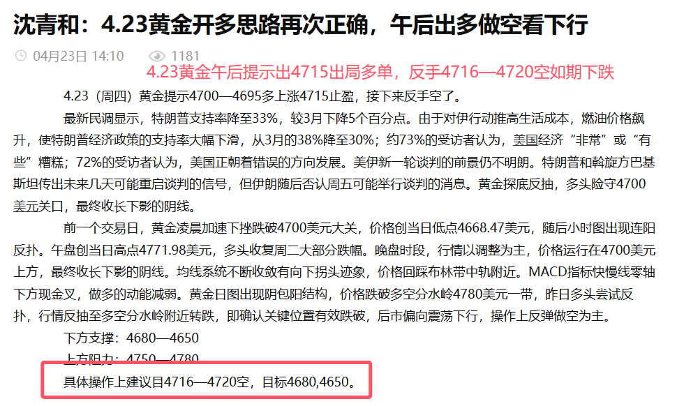 4.23(周四)黄金提示4700—4695多上涨4715止盈,随后反手4716—4725开空再次如期下跌4685拿利。
