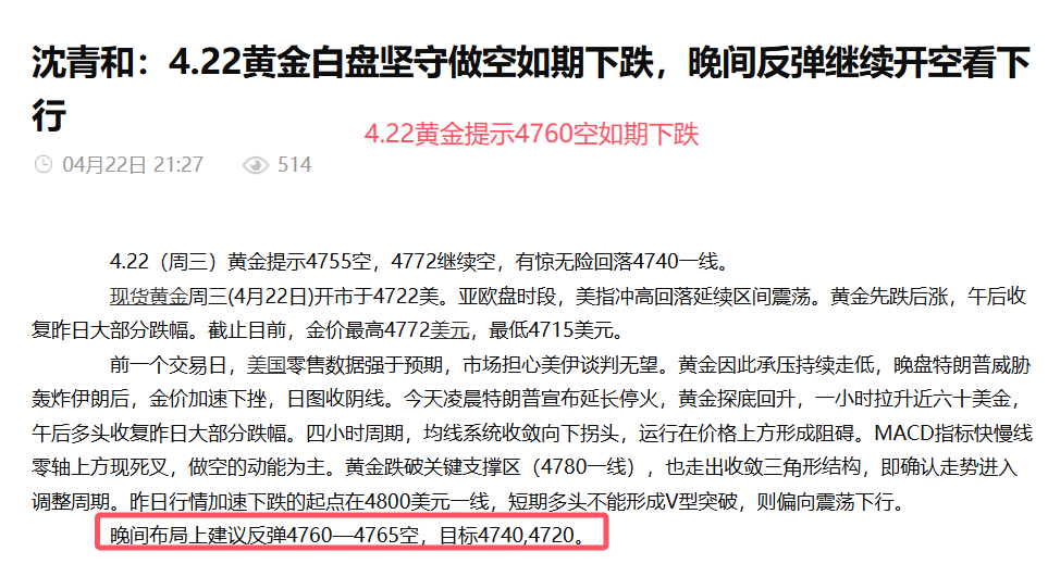 4.14周二上午提示黄金4773/4778做空如期下跌4758一线。下午反弹4790继续提示开空又是如期下跌4752。晚间提示4780再次做空又是如期下跌4762拿利。