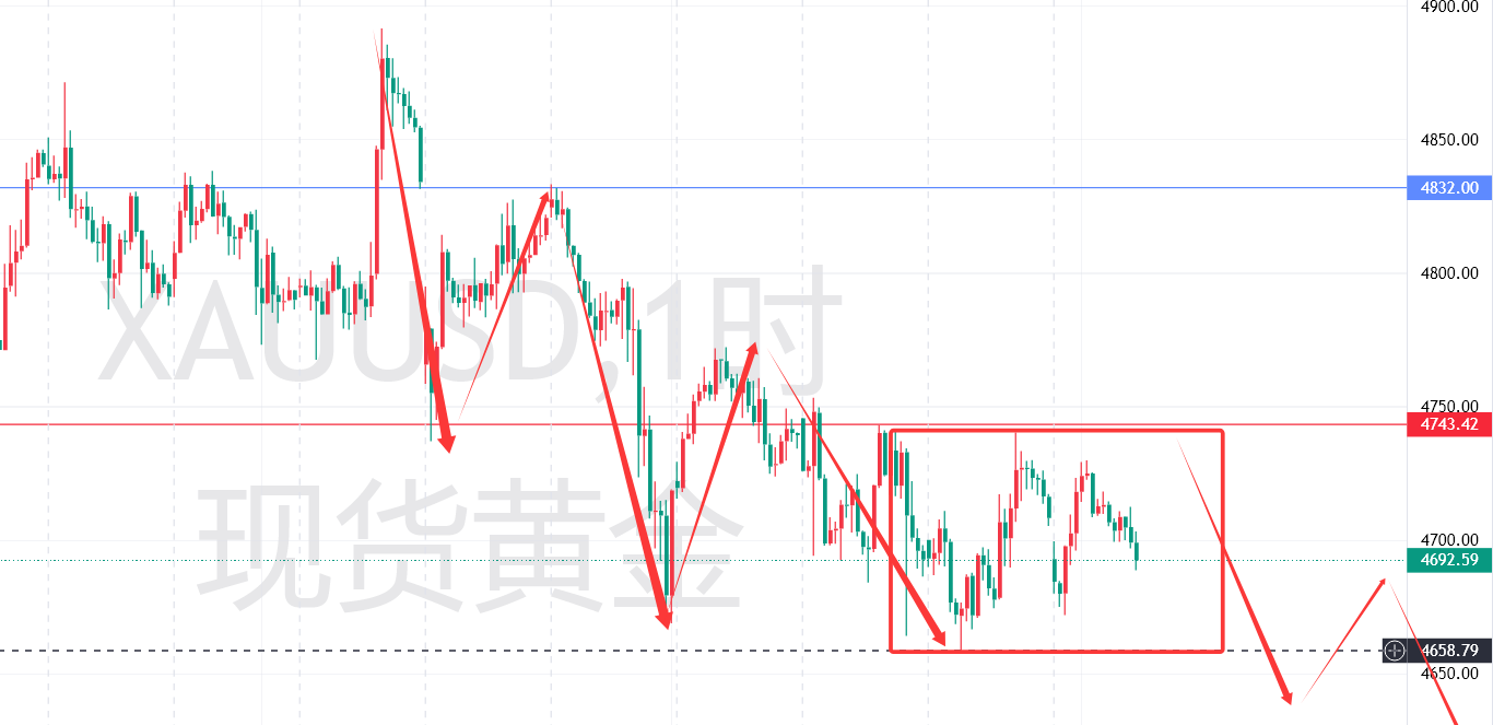短趋势上,关注小时级别,现在的走势偏于震荡,日线与四小时级别上我们分析思路是高空看跌,那么短线上也去执行此思路。现在盘面上阻力可关注4743这里,短期支撑关注4660,跌破此位置后顺应看至4554即可。