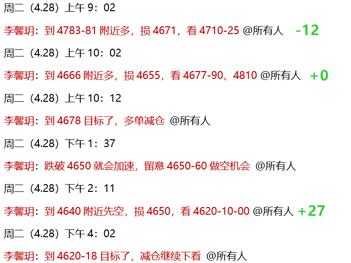 4.28 周二,早间策略提及“黄金反弹高点逐步下移,多次下探测试支撑,就会加大下破风险”果不其然,黄金午后向下破位,实盘中,先是早间4782多单,获利未出扫损出局!而后下探,按策略4666多单,在4678-80获利减仓!午后向下破位,反弹果断安排4640空单,顺利到4618获利!