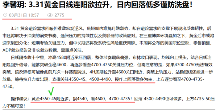 李馨玥: 4.1黄金4540波段多单落袋,看涨不追涨留意强压!