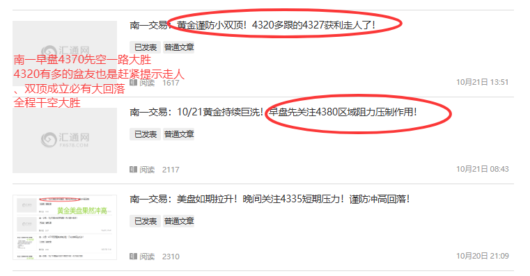南一交易:10/21黄金持续巨洗!早盘先关注4380区域阻力压制作用!