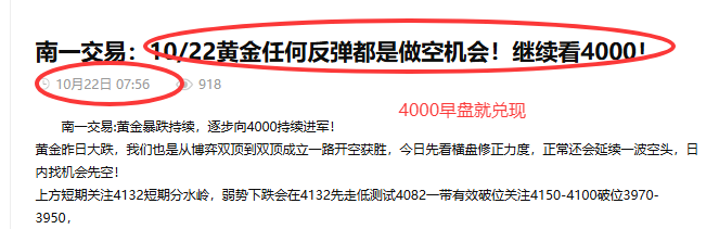 南一交易:10/22黄金任何反弹都是做空机会!继续看4000!