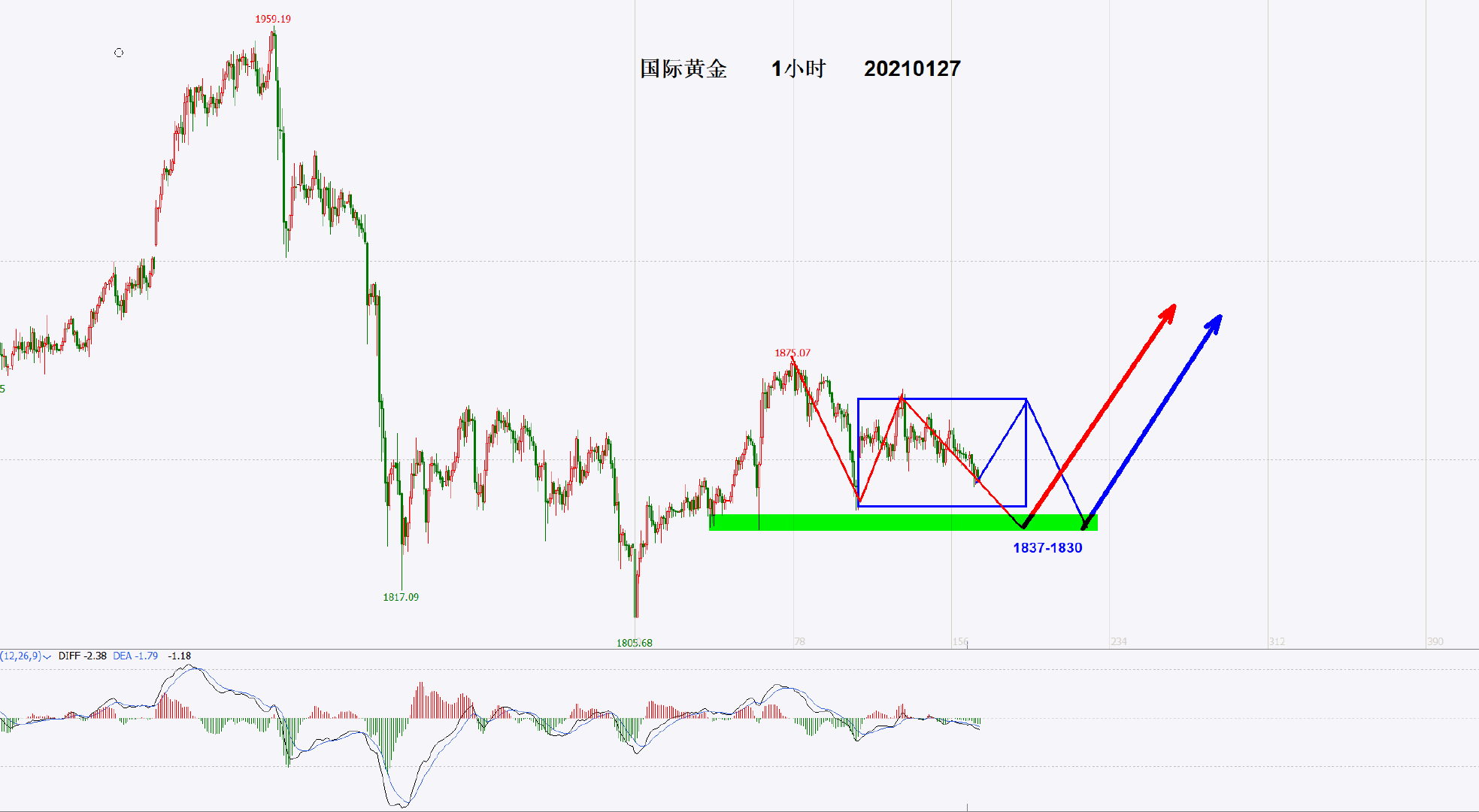 ②有没有可能1817-1875已经完1959下跌B浪调整,1875往下走C浪破底1802,这种概率较小,行情若意外出现等背离继续做多应对。